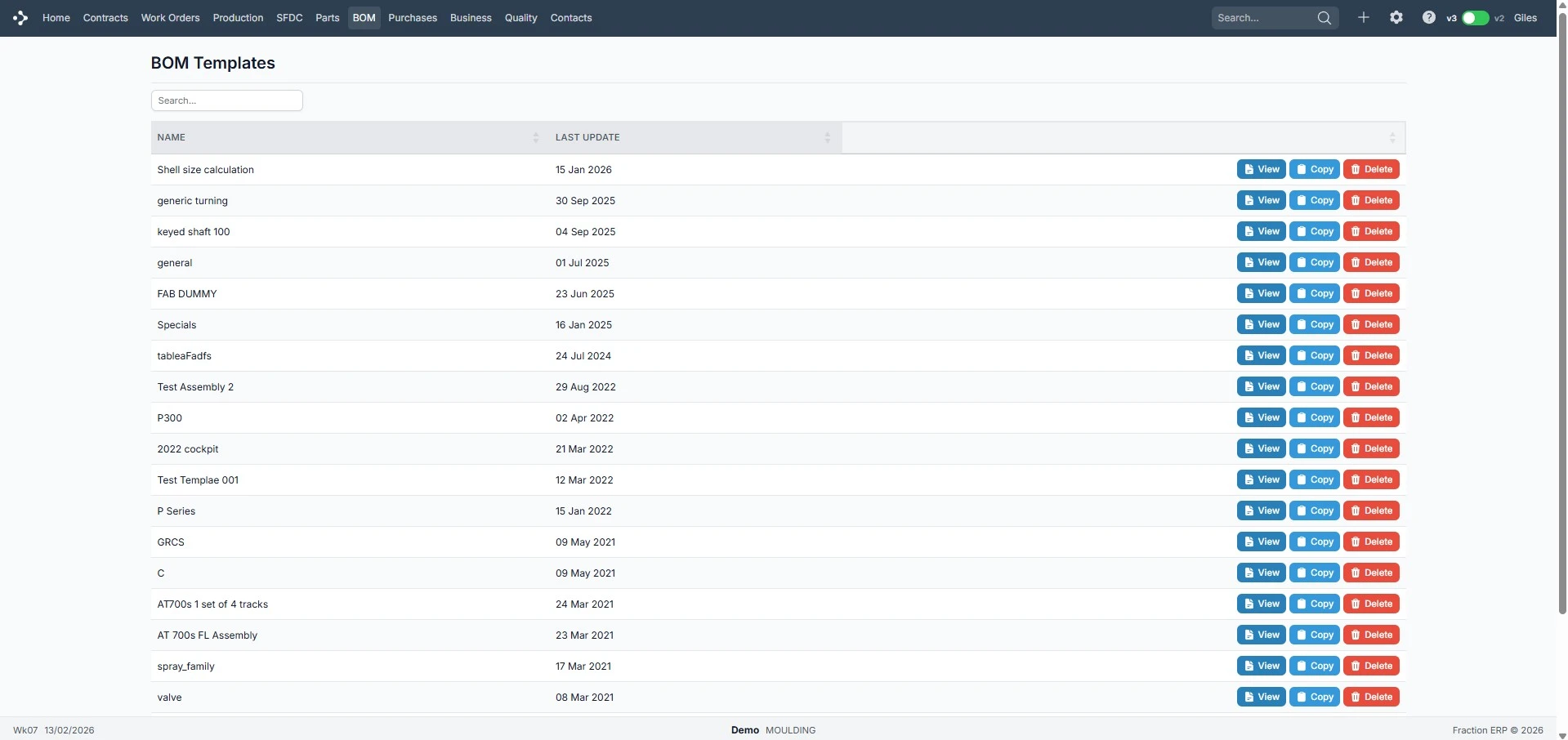 Two key features of Fraction ERP are the BOM templates and the BOM copy function. The templates function allows you to create a generic template for similar products. You can quickly tweak and update the duplicated BOM to create a tailored structure for another product. The BOM copy function allows you to simply copy an existing BOM, which you can then modify. Save time every day if you have similar products that you need to quote and manufacture.