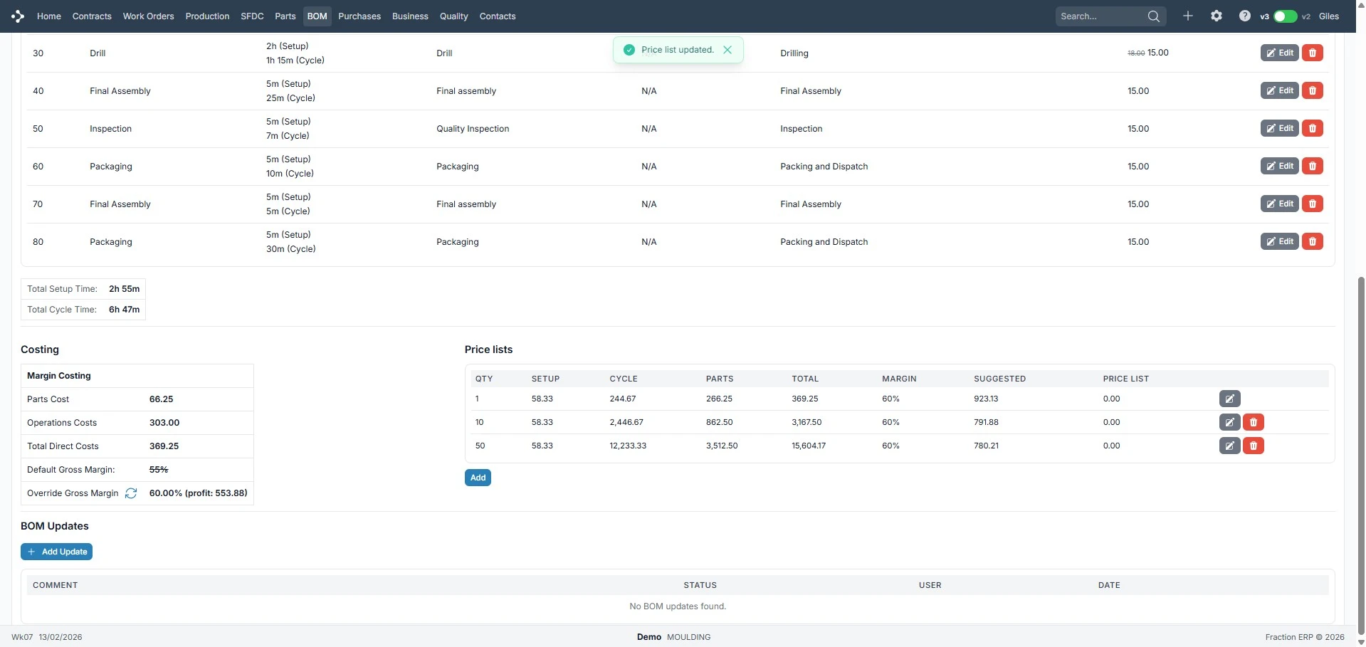 Fraction ERP's job costing is automated and integrated within the BOM module. As you create your Bill of Materials and manufacturing route, the job costing is updated. Create price breaks in seconds using the price break calculator and help reduce the workload when generating quotes.