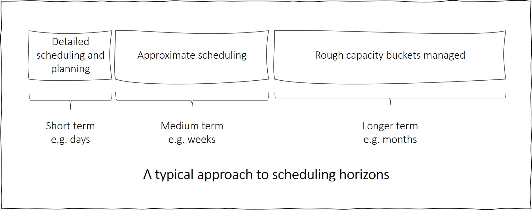 Using the time frames has less to do with durations and more to do with the approach. Many businesses try to schedule everything as though it had to be perfect. The reality is that the orders in several weeks / months time might need to be approximately right. The turbulence in the order book may cause orders to be re-scheduled several more times before you produce them.