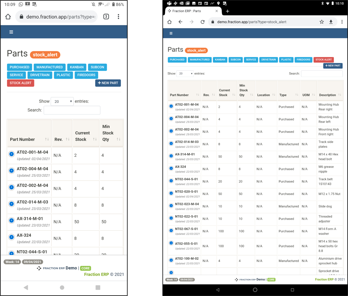 Production tracking screen shown above, on smartphone (left) and 10” tablet (right)