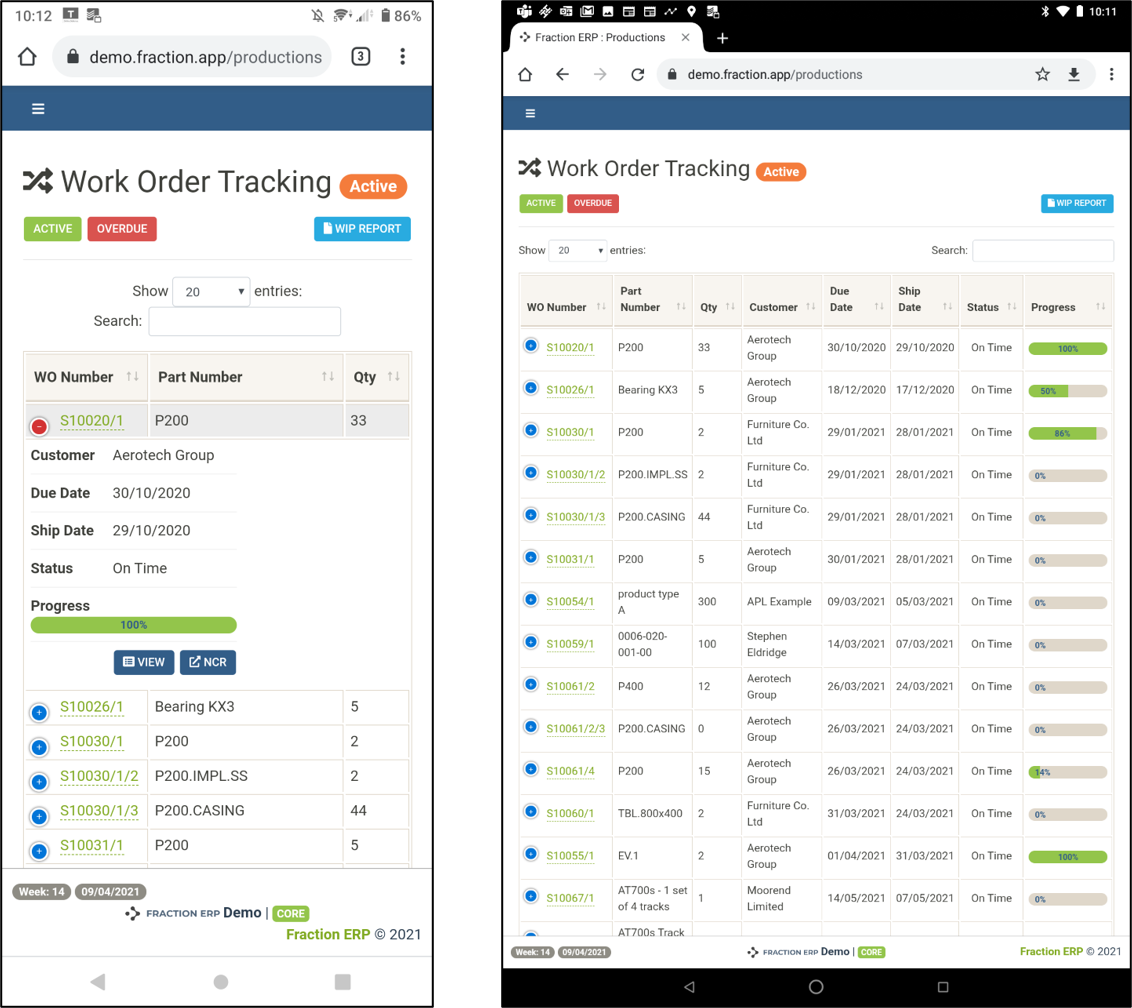 Production tracking screen shown above, on smartphone (left) and 10” tablet (right)