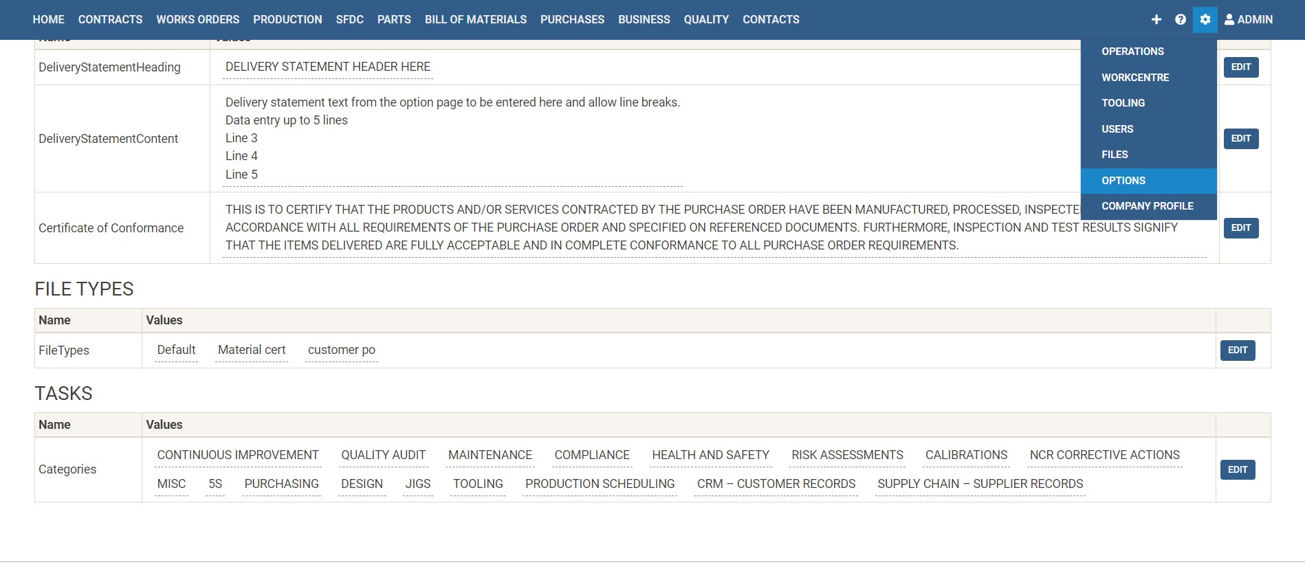 Creating categories is easy, navigate from the options menu down to the TASKS section. Click on the edit button and you can see your current options.