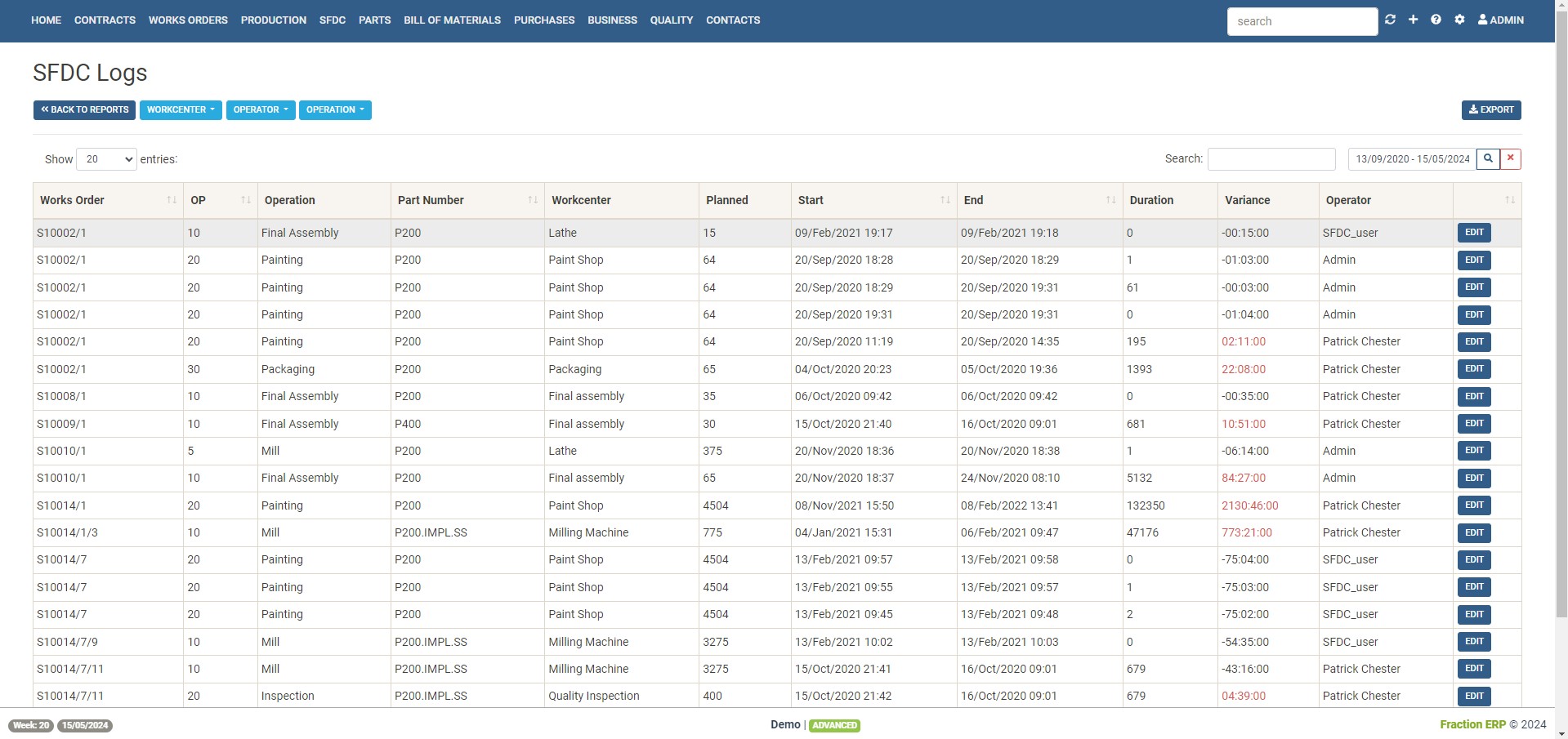 When you use shop floor data collection in Fraction ERP, our system shows you who is logged on to what job and how close they are to the planned operation times.