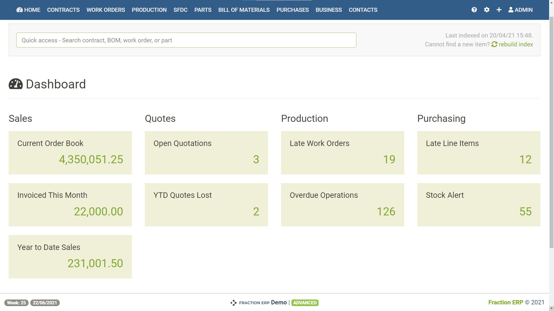 As we believe in managing by exceptions, and that ERP systems are a productivity tool, we’ve moved our dashboard to the first page you see when you log into Fraction ERP.