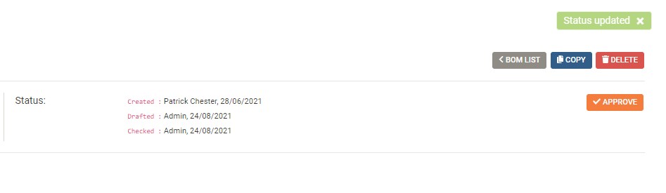 We wanted to make the process straightforward, and that is why we have the simple workflow button in the top right hand corner of the BOM screen. In the image below the BOM has been checked and now it is ready to be approved (and used in production).