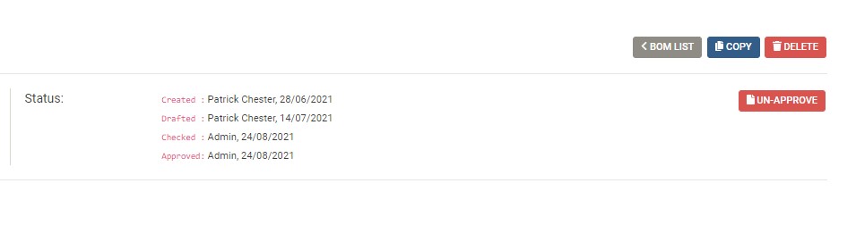 A new feature that we have added is the ‘un-approve’ option. Whenever you make a changes to a BOM it automatically un-approves a BOM and makes you check it again before it can go back into production.