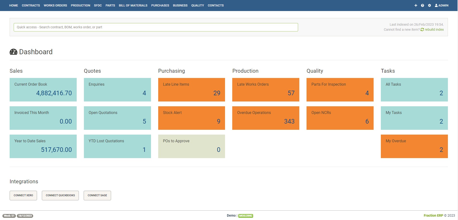 The first page you come to within Fraction ERP, the dashboard, allows you to manage your business by exception reporting. Sunrise meetings / production meetings can be really easy to run, especially when you use our task management module.