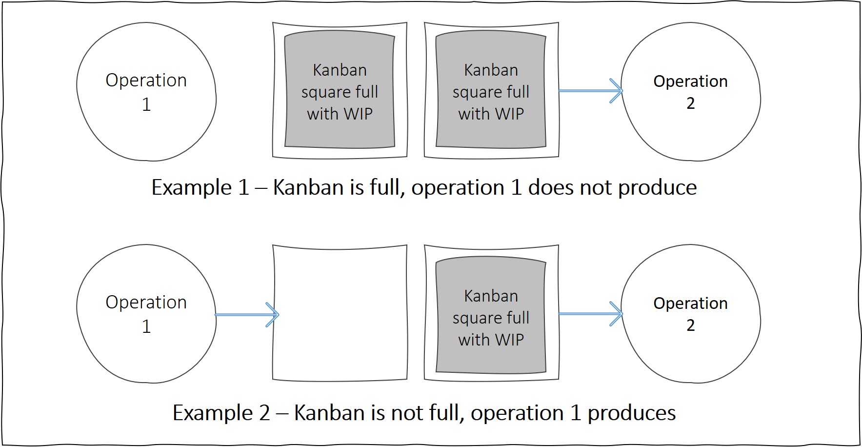 In short, a Kanban is a visual pull system that synchronises demand and supply. They come in many shapes and forms and the essence of their mechanism is that production does not occur unless there is a visual demand. The visual demand may be a square on the floor that has been emptied of its WIP (Work In Progress) or an empty box on a consumables rack. The message is simple; if the box / square is empty you can produce the next unit of production. If it isn’t empty don’t produce anything.