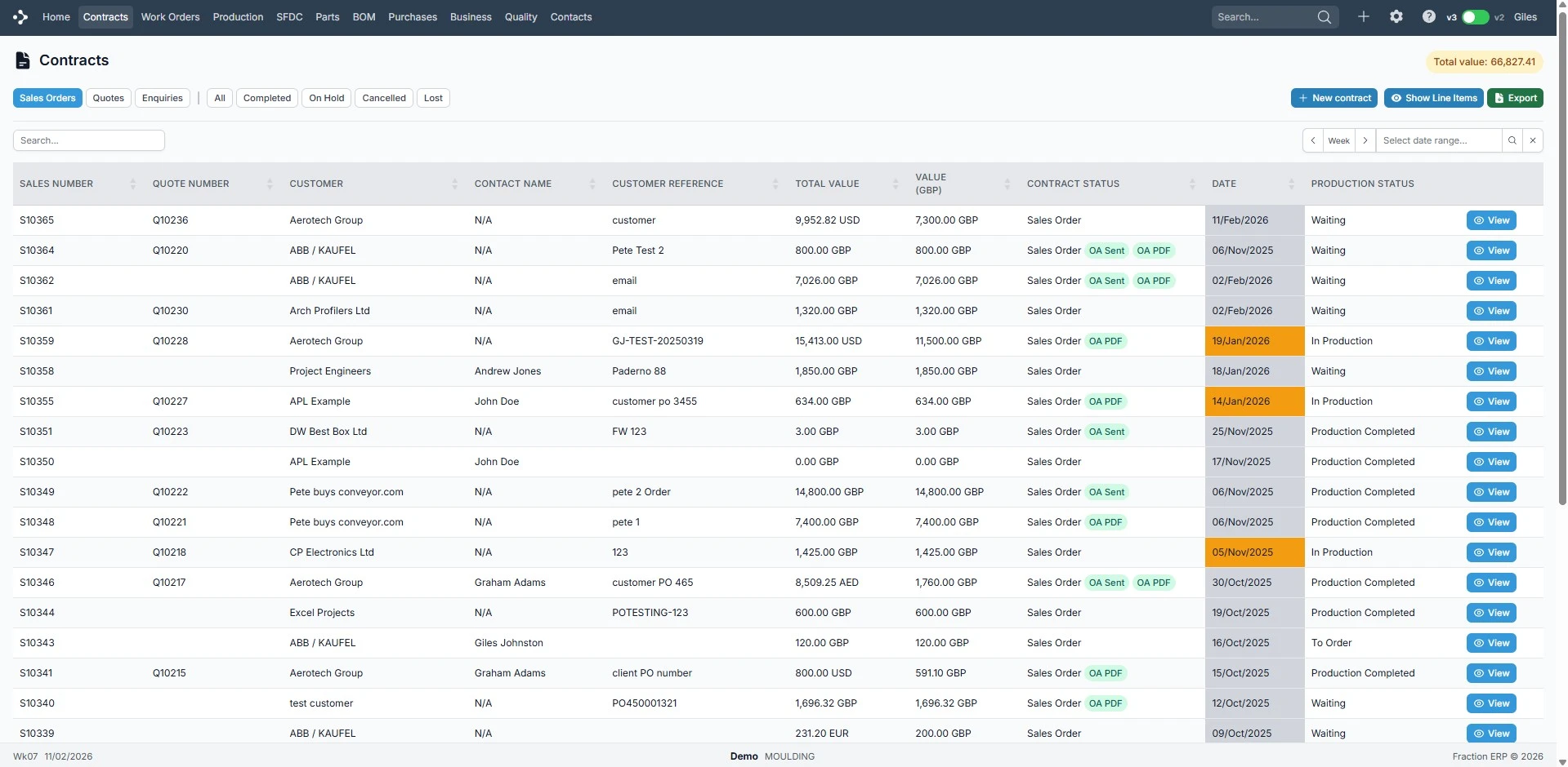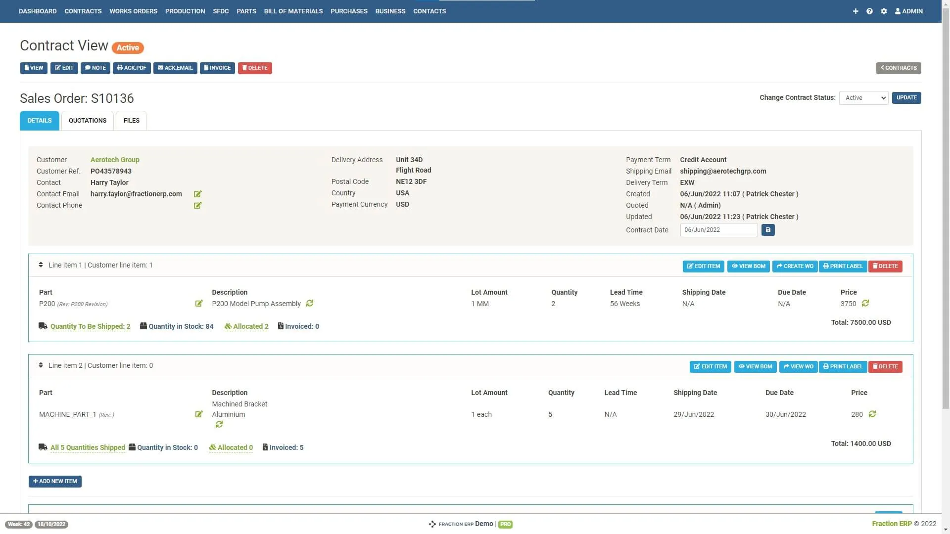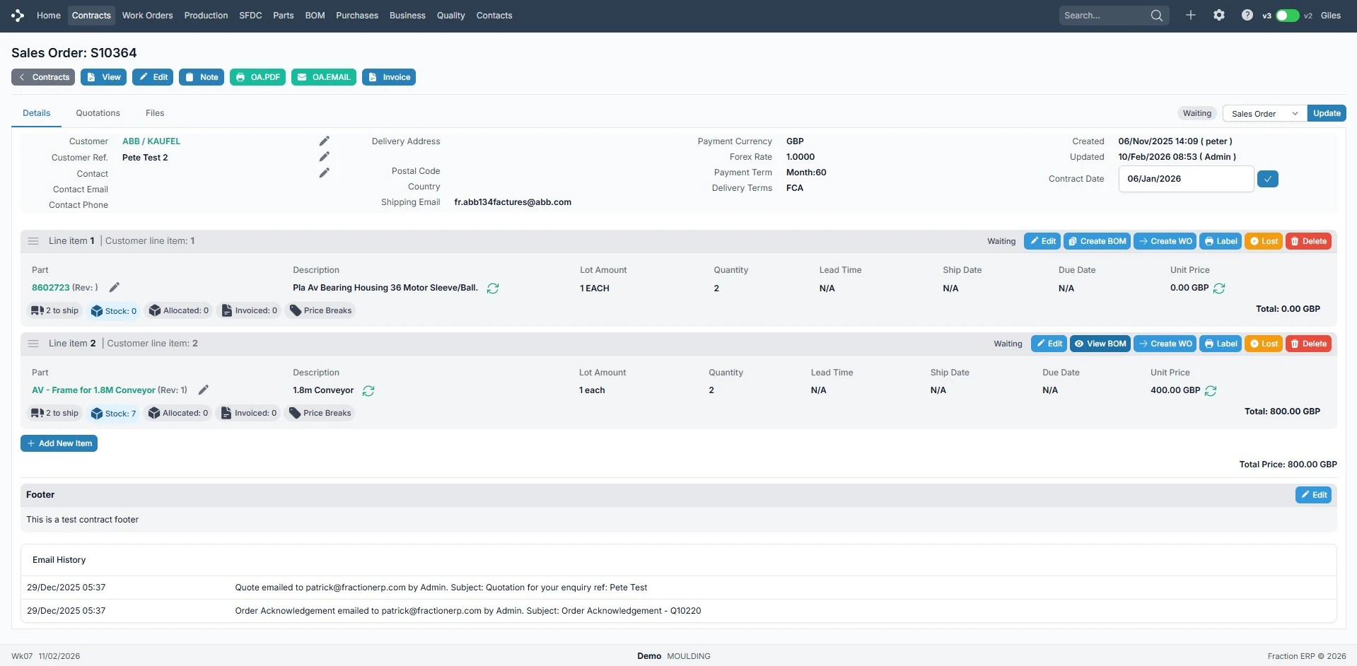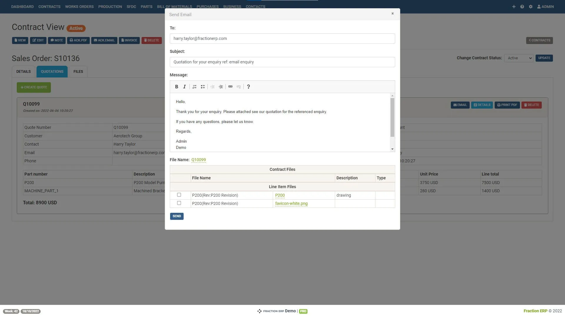 Convert your quotes to sales orders with no fuss. Just update your quote to a sales order in the contracts module and email with just a couple of clicks. Send order acknowledgements directly from Fraction ERP.