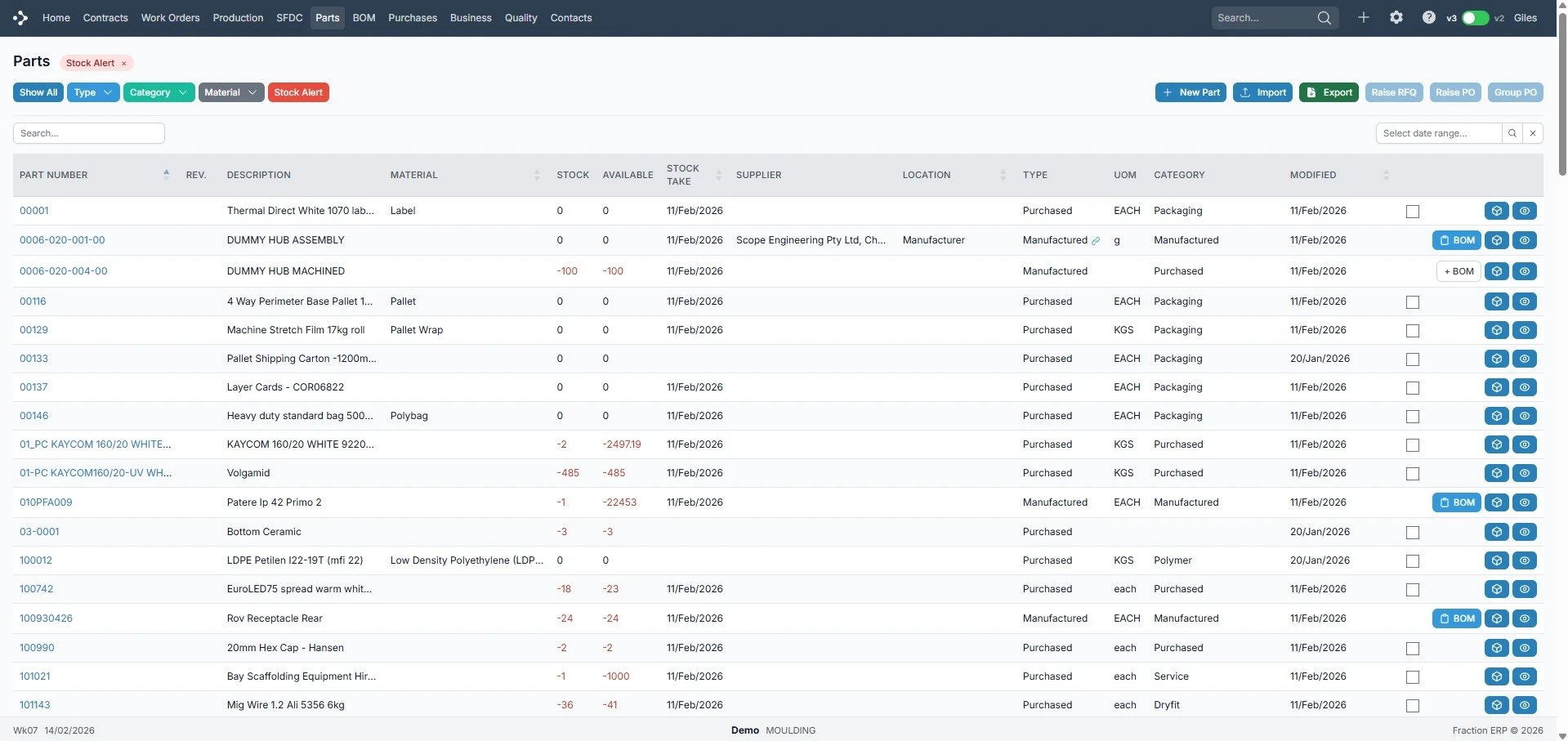 Fraction ERP allows you to define the parts you need to run your business. These could be the raw materials you need in production. Or the components you need during an assembly operation. It could even be the service items you provide to your customers. Whether the parts are manufactured, or service related, Fraction ERP lets you define this information, vital for an effective Bill of Materials.