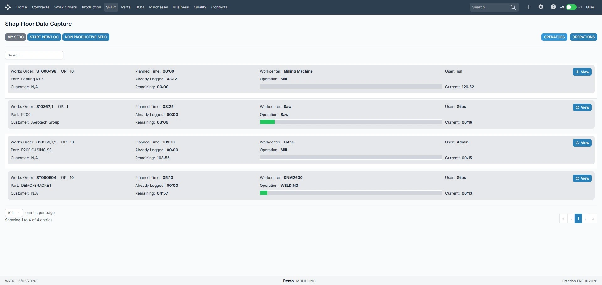 Operators can securely access Fraction ERP and log time and progress against your works orders. View progress against your production operations in real time.